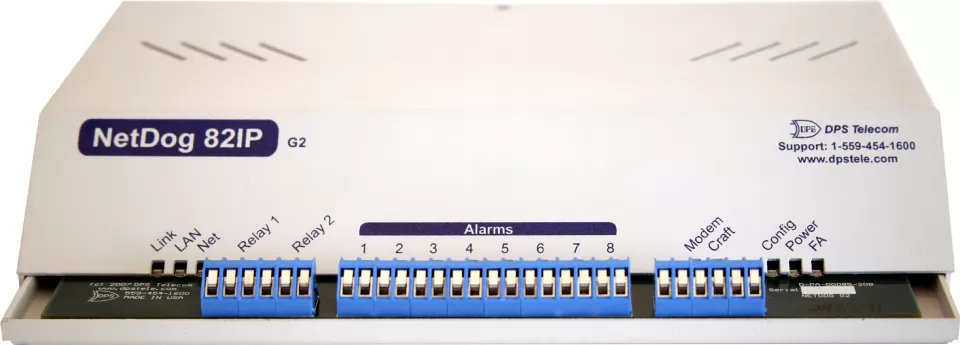 The powerful LAN-based NetDog 82 IP G2 telecom RTU provides network managers with remote visibility, allowing them to keep watch of their IP network elements. With 32 ping alarms, 8 discrete alarms, 0-4 analogs, 2 control relays, and a reach-through serial port, this compact, versatile unit is the ideal network monitoring solution for small to medium-sized sites.